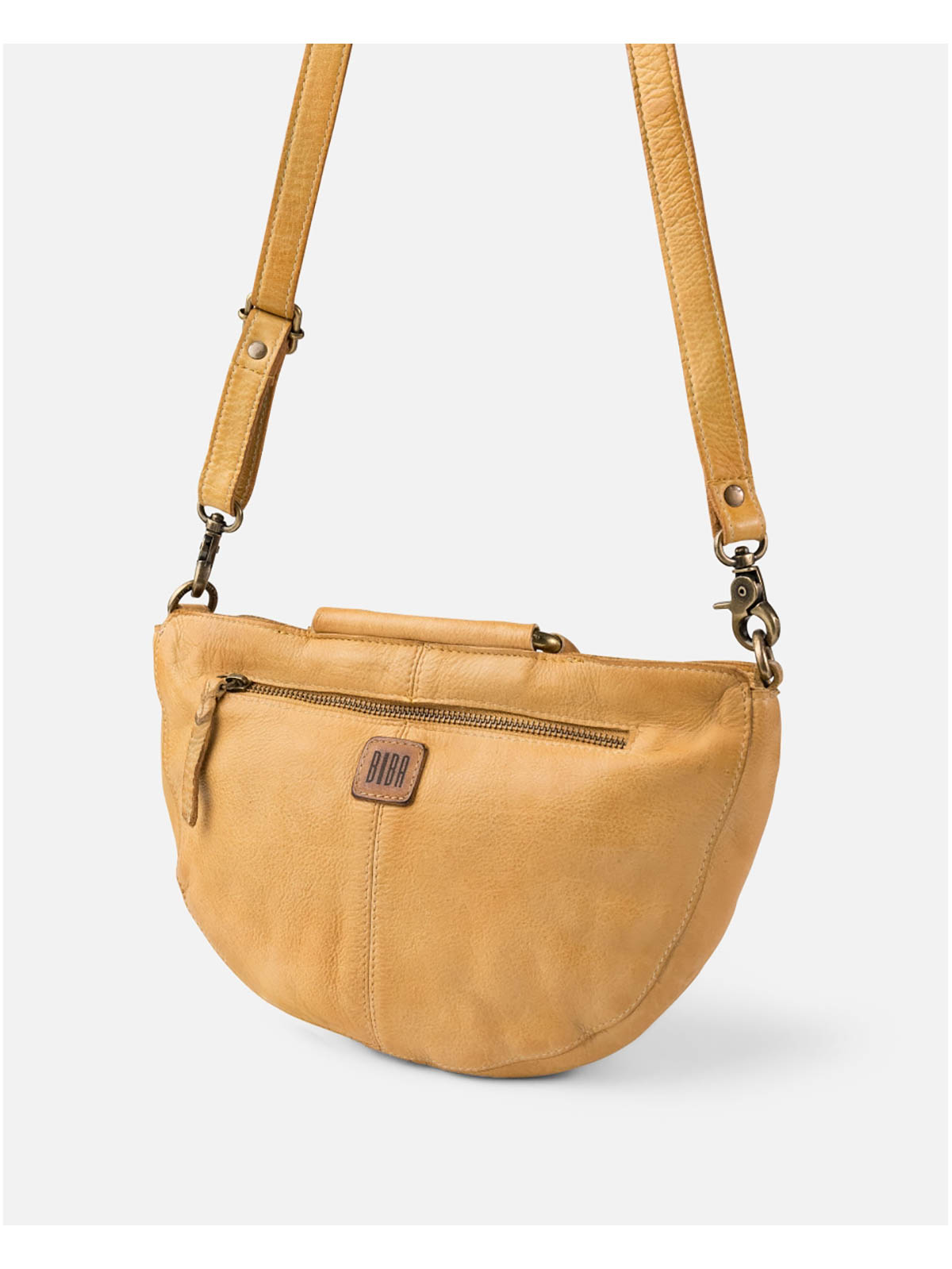 Bolso de mano BIBA Milbridge de piel vacuna lavada.. Modelo mediano. Doble asa de mano forrada, bandolera regulable y extraíble. Cierre con cremallera. Formato mini capazo. Bolsillos externos e internos. Forro de algodón.