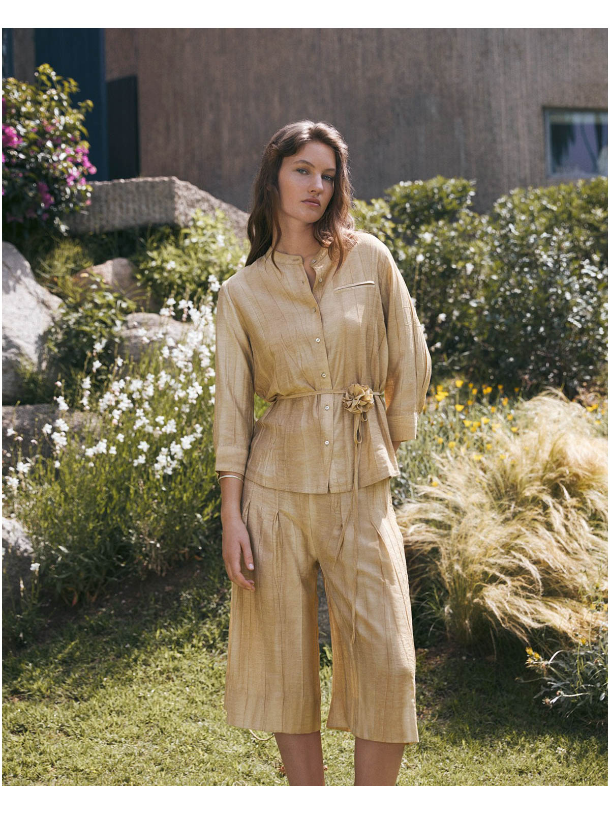 Pantalones fluidos en tejido tencel. Cintura media con trabillas.